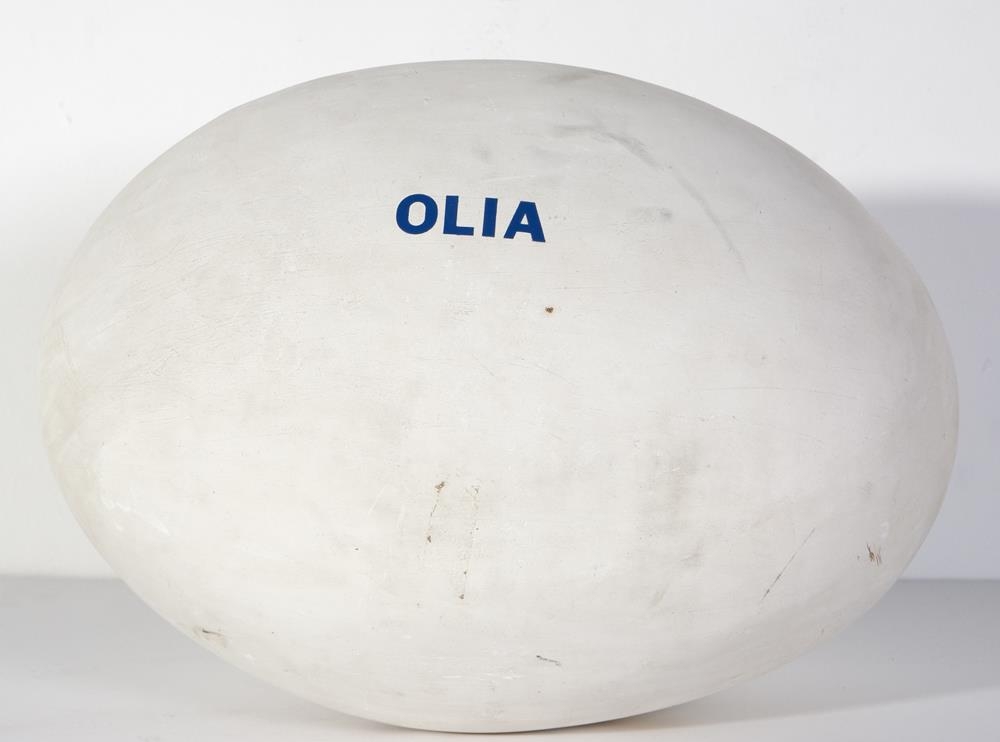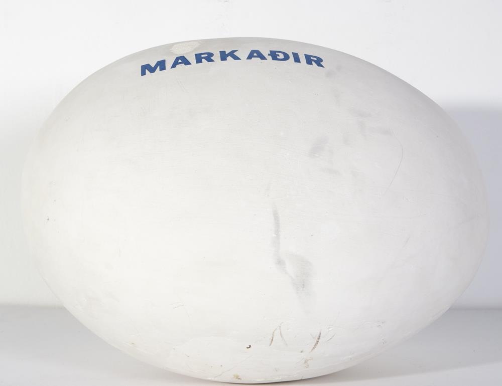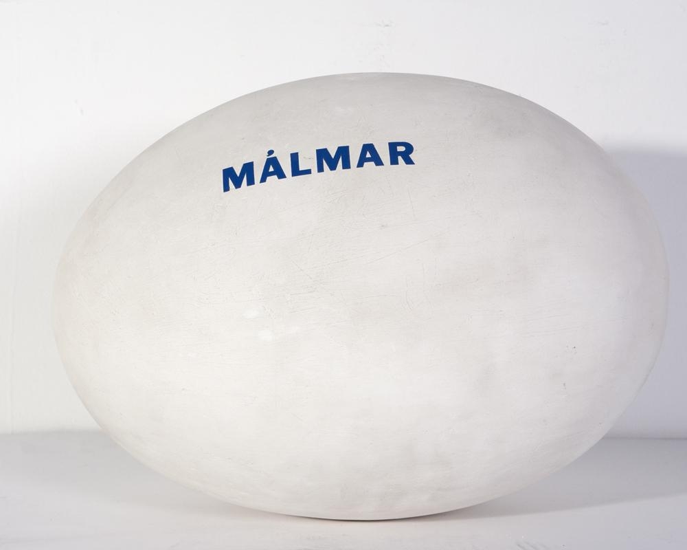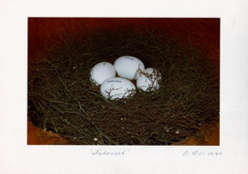 Fjórar einingar. Fjögur stór, hvít gifsegg. Á hverju þeirra eru bláir límstafir úr plasti sem mynda orð eða setningar: Olía, Markaðir, Ódýrt vinnuafl, Málmar. Ekki er vitað um hreiðrið. Eggin lágu ofan í hreiðri þegar það var sýnt árið 1979. Ljósmyndir úr gagnasafni Nýlistasafnsins.