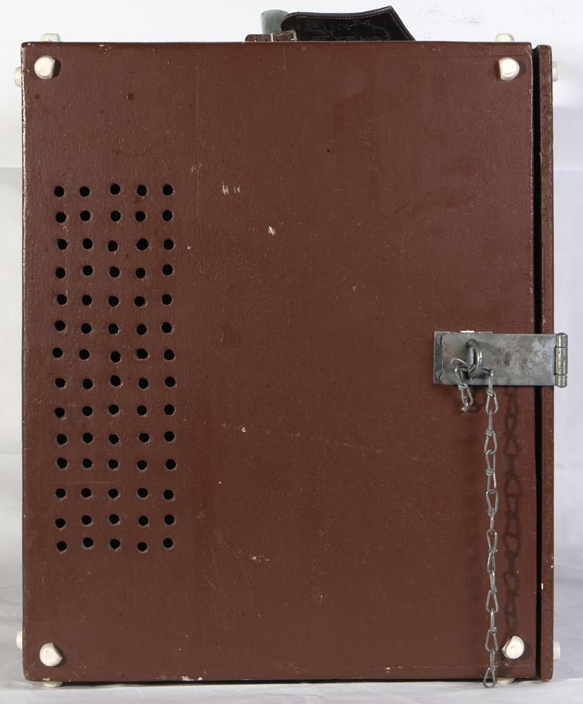 Brúnn kassi: settur saman úr spónaplötum, málm-handfang ofan á með merkispjaldi. Hægt að opna kassann framan á (málmhjarir hægra megin), hvítir nabbar á öllum hornum (nema þar sem hjarirnar eru og hjá handfanginu). Göt á vinstri-hlið kassa. Inni í kassanum er mikið af svörtu plasti. Leiðbeiningar: vélritað A4 blað á svartmálaðri spónaplötu og með glærri plexí-gleri skrúfaðri ofan á.