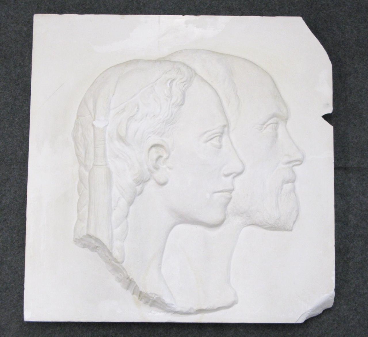 Gipsmynd, vangamynd af Jónasi Eirikssyni (17.06.1861, d.19.08.1928) skólastjóra Búnaðarskólans á Eiðum og Guðlaugu Margréti Jónsdóttur (30.06.1853 d.25.05.1906) konu hans frá Eiríksstöðum í Jökuldal. Jónas var annar skólastjóri skólans árin 1888 til 1906 en þá fluttu þau hjón í Breiðavað. Afsteypan er eftir Einar Jónsson myndhöggvara og var gerð 1949. Þessi afsteypa kom til safnsins frá Búnaðarsambandi Austurlands.