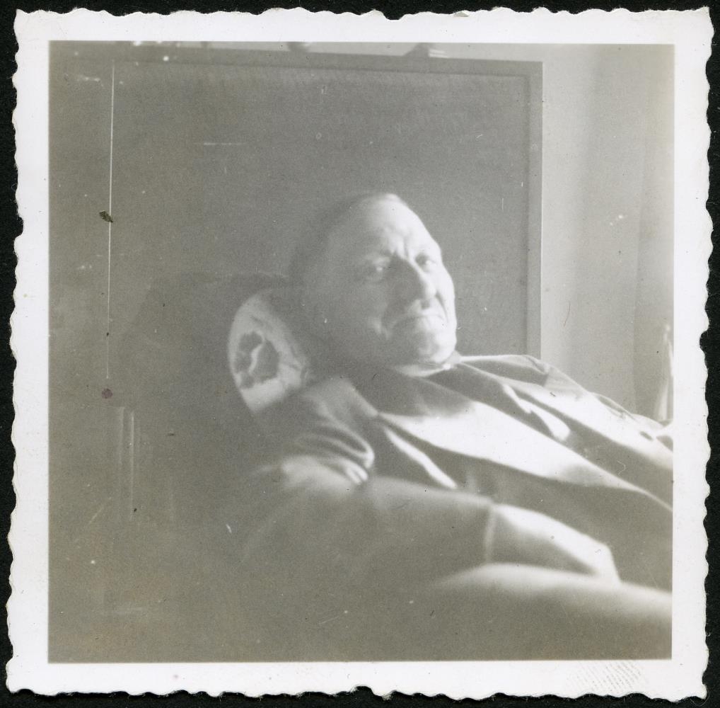 Fullorðinn karlmaður situr makindalega í hægindastól. Við myndina er skrifað: Allar teknar sumarið 1944. Guðm. Egilsson.