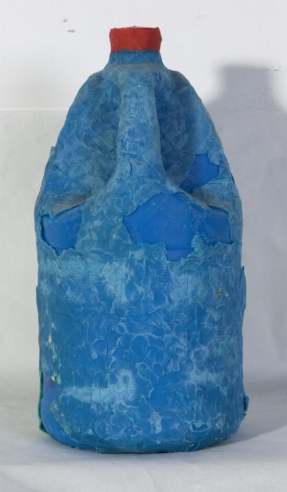 Blár plast brúsi, hulin með sæ-grænum (myndar bogadregið form) og bláum leir, rauður tappi.