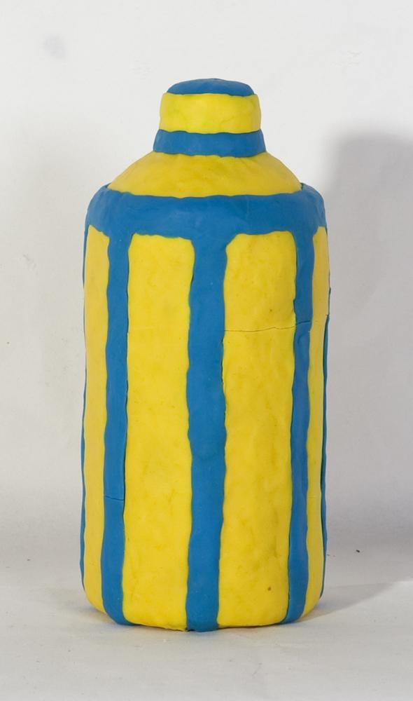 Plast hlutur hulinn með lituðum mjúkum leir - gulum og bláum. Form hlutarins minnir á flösku, litirnir mynda lóðréttar rendur (gulur breiðari en sá blái).
