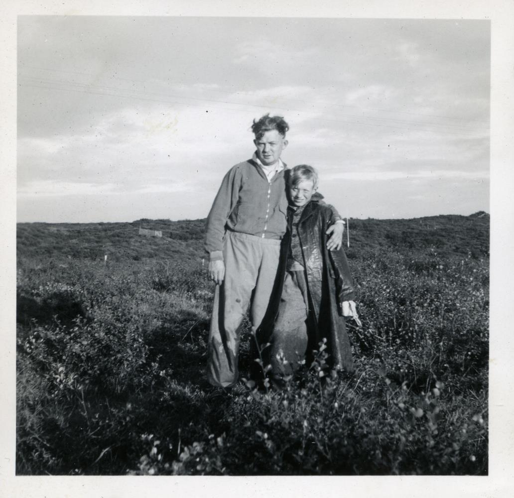 Karlmaður, Sigurður Jafetsson, og piltur standa saman í lyngbreiðu og heldur maðurinn um axlir drengsins. Við myndina er skrifað: September 1944. Siggi og Addi..