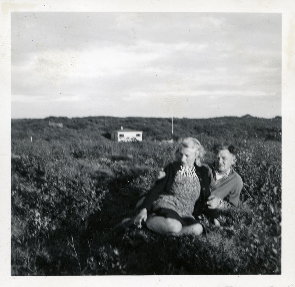 Hjón, Ásta og Sigurður, sitja í lyngbreiðu, sumarbústaðurinn í baksýn f. miðju. Við myndina er skrifað: ásta og Siggi..