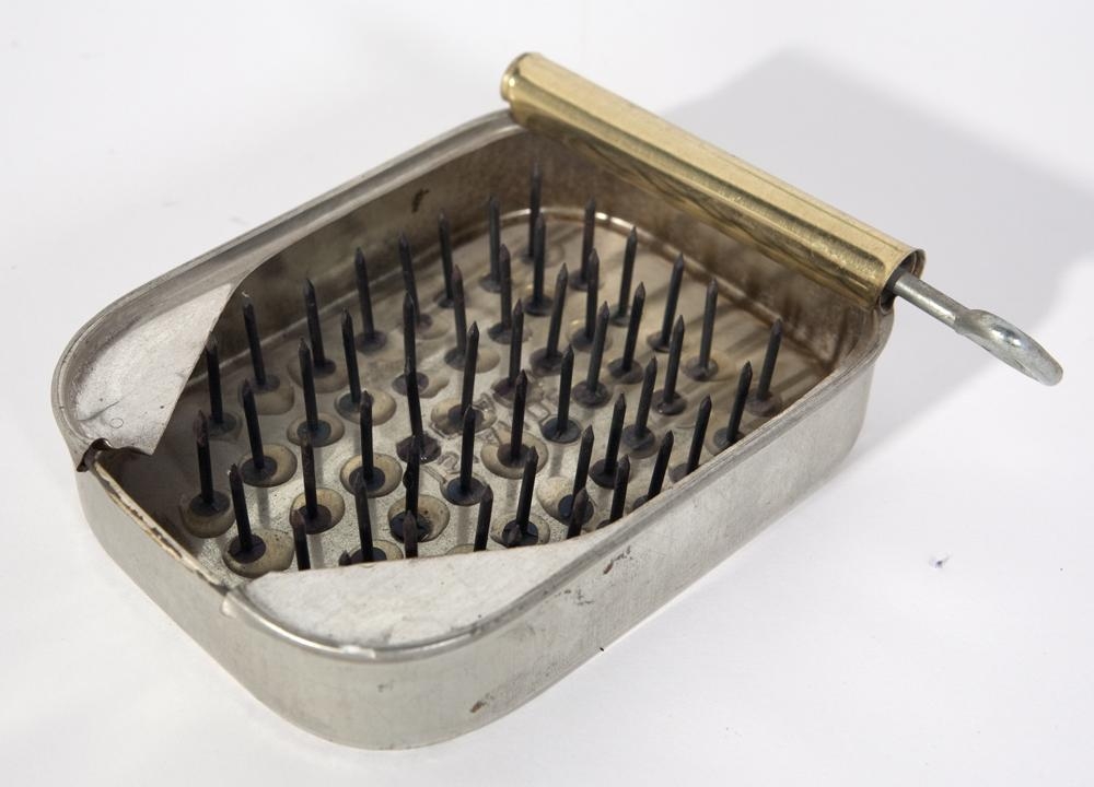 Málmdós (mögulega sardínudós), opin með lykli. Ofan í dósinni eru svartir naglar með breiðum haus (hausinn niður, oddurinn upp). Undir dollunni er áletrunin 'Islande' og 'Iceland'.
