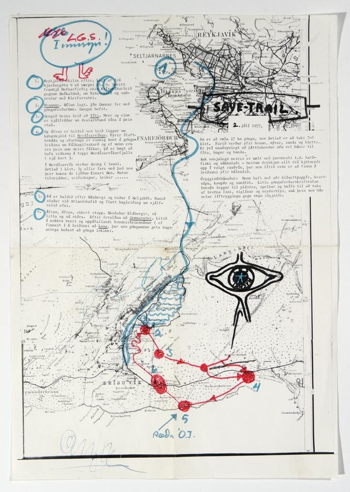 Göngukort sem J.G.Á. fyrir eina af ferðum Litlu gönguferðarstofunnar Innsýn. Svart prent á hvítan pappír, teiknað yfir prentið með penna og tússÁ kortinu má sjá gönguleið ásamt áfangastaðnum og lýsingu á þeim sem gengu og göngunni sjálfri. Hægramegin við miðju er teiknað auga en það mun vera merki 'LGS Innsýnar' en einnig líkleg vísun í verkið 'Augað' eftir J.G.Á.