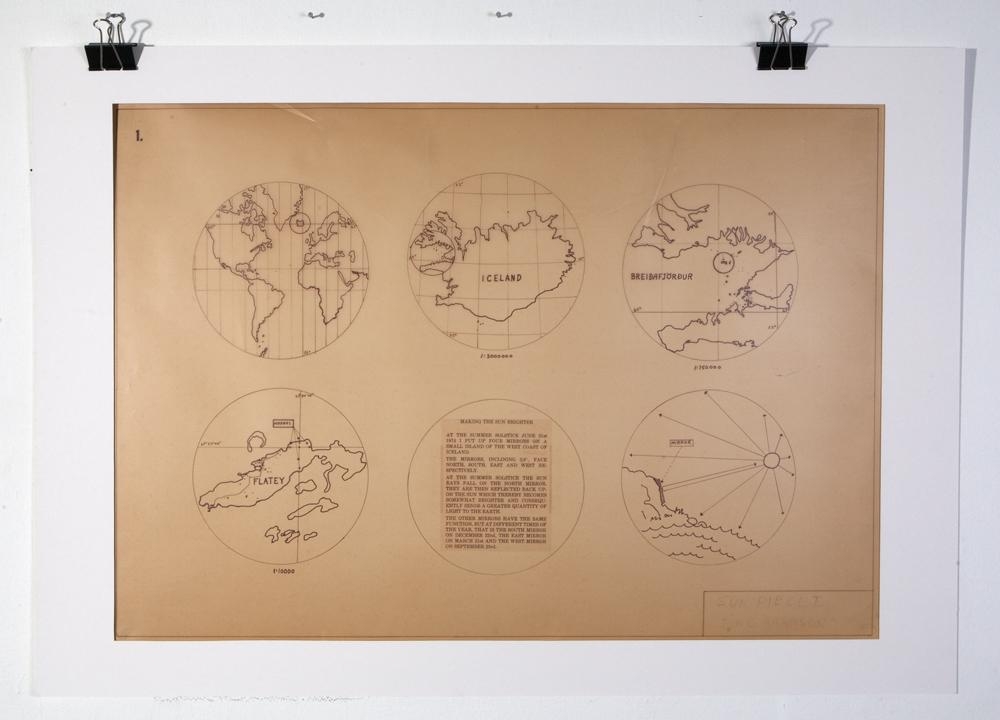 Fjórar einingar, eiga það allar sameiginlegt að vera pappír (grafíkpappír eða landakort), límt á pappa. Heimildir um gjörning - ljósmyndir, texti og grafík. Nánari lýsing:1. eining: Kort af Flatey er límt á pappa. Hægramegin við kortið er prentaður texti sem er klipptur út og límdur á pappann. Textinn lýsir gjörningnum og aðdragandanum að honum: 'Á Jónsmessunni 21. júní 1974, setti ég upp fjóra spegla í Flatey í Breiðafirði. Þeir snúa í suður, norður, austur og vestur. Þegar geislar sólarinnar lenda á þeim endurkastast þeir til baka og gera sólina bjartari. Hnattstaða verksins er 22 54' 48" v.l. og 65 22' 42" n.bv.'2. eining: 22 svarthvítar ljósmyndir af gjörningnum. Ljósmyndirnar eru límdar á pappa og merktar með tölustöfum. Upplýsingar um ljósmyndirnar eru einnig límdar á pappírinn.3. eining: Kort af heiminum prentað á grafíkpappír sem er límdur á pappa. Á kortinu er búið að bæta textabrotum um gjörninginn. Grafíkpappírinn er ljós-gul-brúnn á lit (ekki vitað hvort hann hafi gulnað).4. eining: Sex hringir prentaðir á grafíkpappír, sem er límdur á pappa og svo í ramma. Inn í fjórum hringjum er brot af kortum af Íslandi eða stöðum á Íslandi. Í einum hringnum er útskýringarmynd af gjörningnum. Í síðasta hringnum er texti um gjörninginn á ensku. Grafíkpappírinn er ljós-gul-brúnn.
