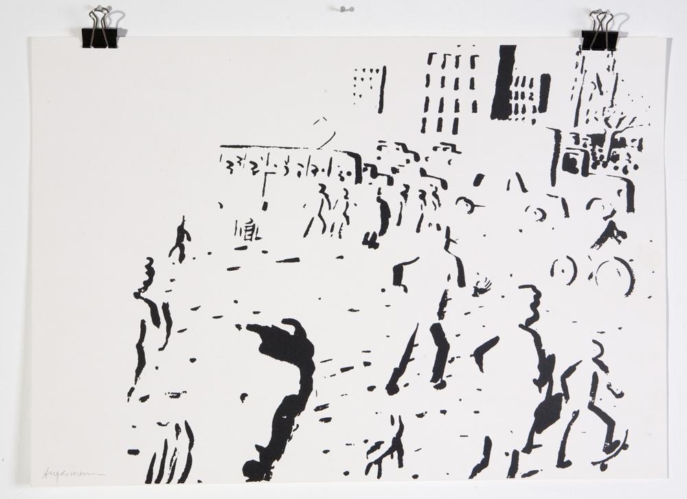 Þrykk með svartri málningu á hvítan flöt. Mótar fyrir verum, úlínur óskýrar. Gata í forgrunni, fólk gengur. Neðst til hægri er vera með hjólabretti, neðst til vinstri er vera sem snýr að áhorfanda. Í bakgrunni eru háar byggingar, tré, bílar, vörubíll, einhver á hjóli. Vinstramegin er lest og hópur fólks.
