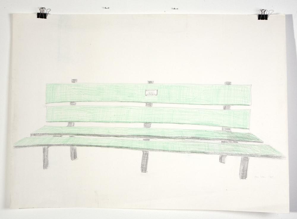 Teiknuð mynd af grænum garðbekk. Á bekknum er skjöldur semá stendur: 'Gestiftet von Jann Voss fur Nýlistasafnið'.