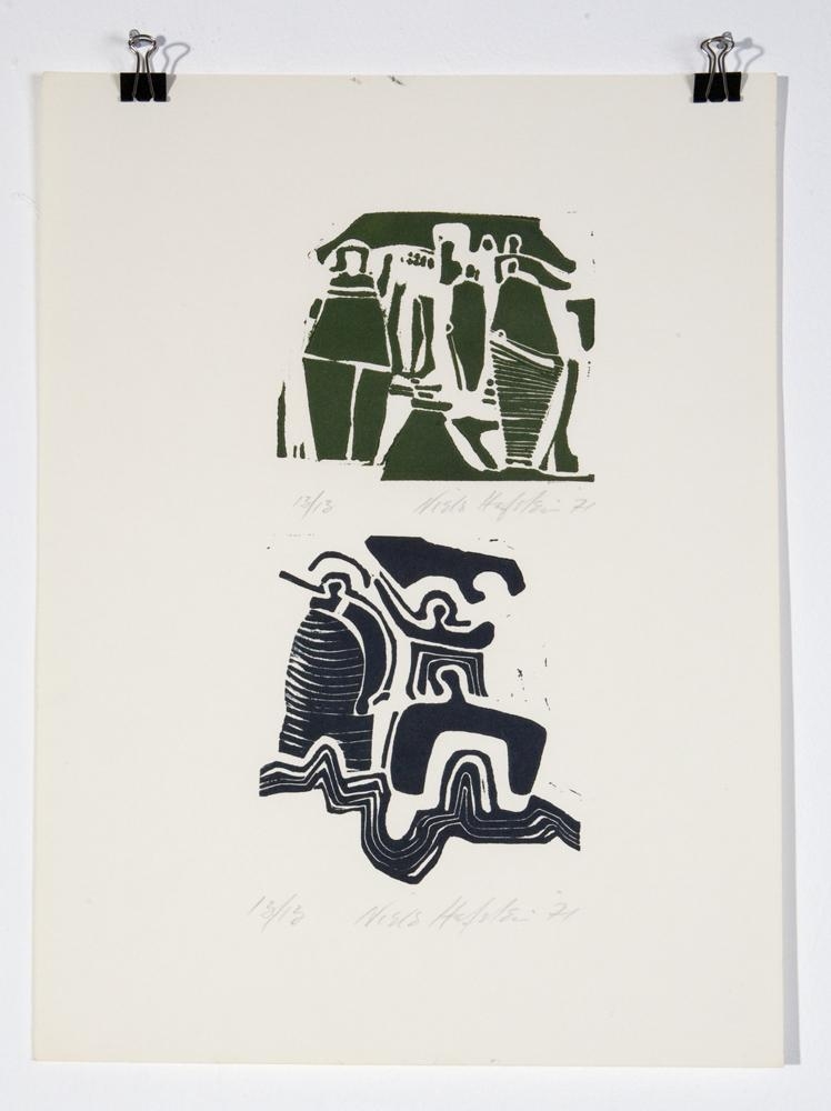 Tvö eintök - hvert eintak, þ.e. hvert blað, sýnir tvær grafíkmyndir. Efri myndin er dökkgræn og sýnir nokkrar mannverur - teiknaðar með einföldum línum. Neðri myndin er prentuð í svörtum lit og sýnir einnig mannverur en með enn einfaldari línum - hálf u-laga.