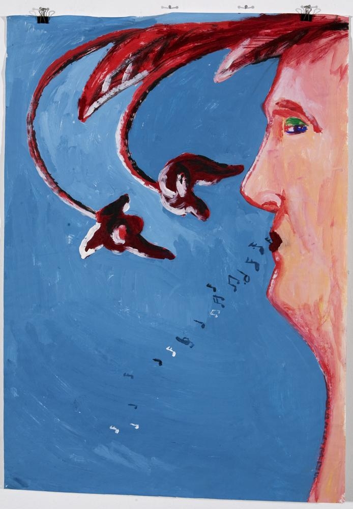 Akríl á pappa. Prófílmynd af manni. Úr hári mannsins koma út angar, teygja sig til hægri, tveir angar snúa að andlitinu. Úr munni hans koma bláar, hvítar og svartar nótur, dreifist um myndflötinn og niður í vinstra horn. Bakgrunnur blár.