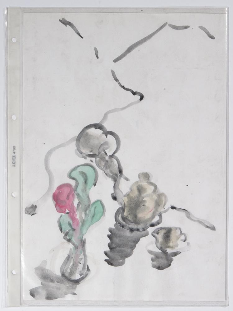 Vatnslitamyndir á hvítan pappír, geymt í glærum plastvösum1. eining: mynd af tekatli, vasa og blómi, rauð, græn og svört málning2. eining: svört og hvít málning, mynd af ketti, virðist í lausu lofti3. eining: Svört og brún málning, mynd a tekatli og mjólkukönnu. Þar við hliðina á er mynd af tveimur blómum og vasi