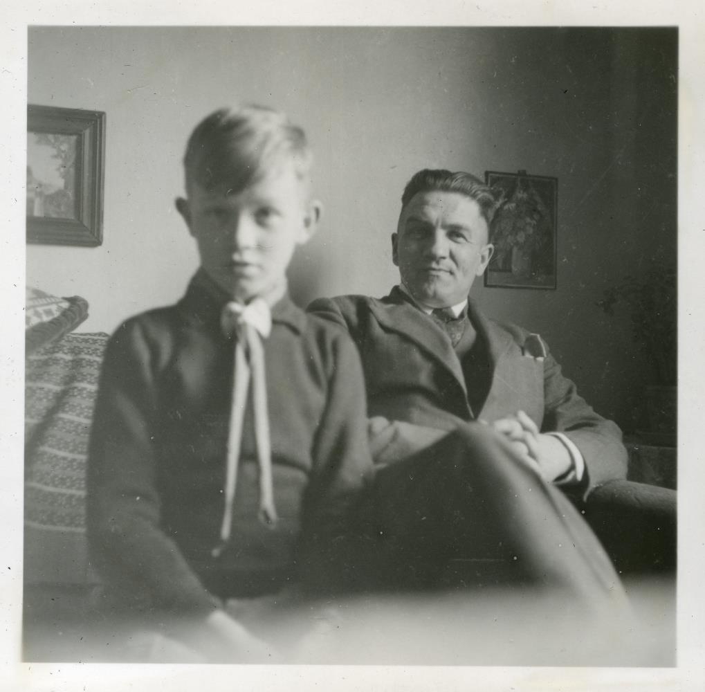 Strákur og karlmaður, feðgar?, sitja saman í sófa. Við myndina er skrifað: 1945. Grétar. Har[aldur].
