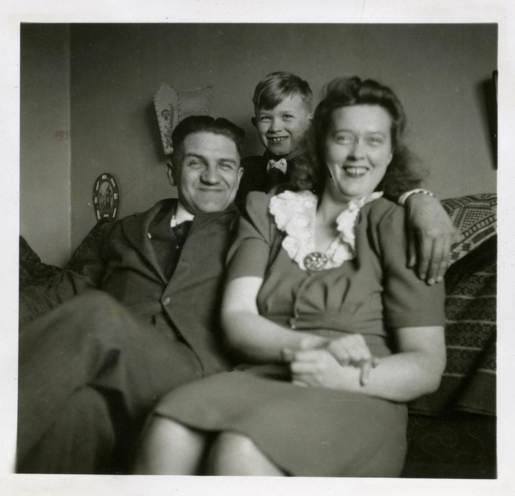 Haraldur, Grétar og Marta sitja í sófa. Við myndina er skrifað: 1945. Har., Grétar, Marta.