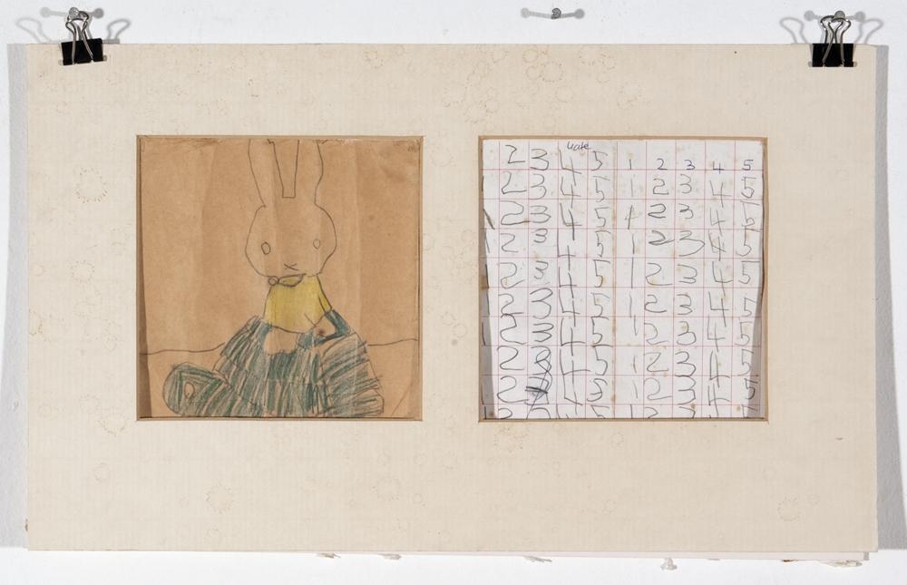 2 einingar, rammaðar inn með hvítum stífum pappa1. Teikning á brúnan pappir - blýants- og trélitateikning af kanínunni Miffy, sitjandi á skjaldböku. Barnslegt handbragð2. Rúðustrikað blað, rúðurnar fylltar með tölunum 1, 2, 3, 4, 5 - marg endurtekið (2 sinnum lárét, 10 sinnum lóðrétt), gerðar með blýanti. Barnslegt handbragð.