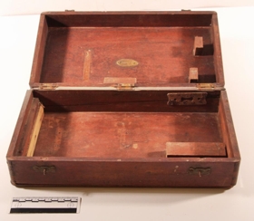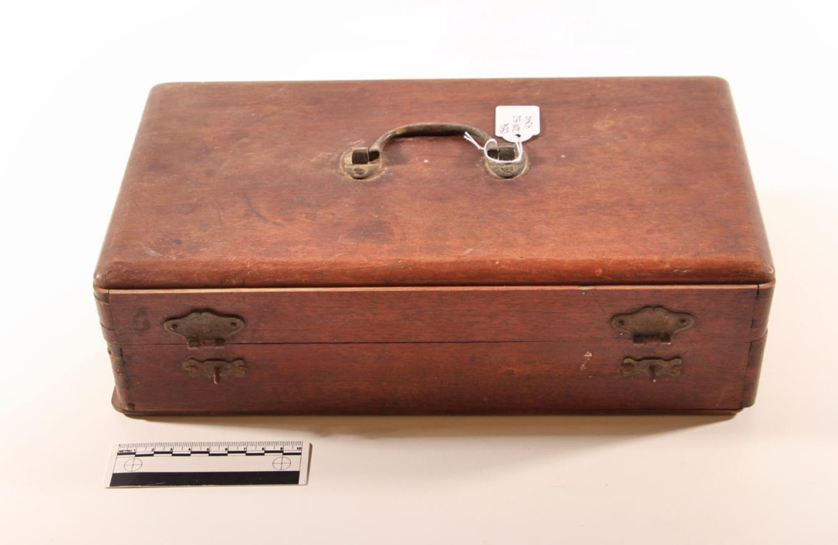 Trékassi með koparhandfangi. Lengd 35 cm, breidd 19 cm og hæð 10 cm. Læsingin er einnig úr kopar. Var notaður sem lækniskassi. Botninn á kassanum er laus. Tvær hjarir og geirnegldur.