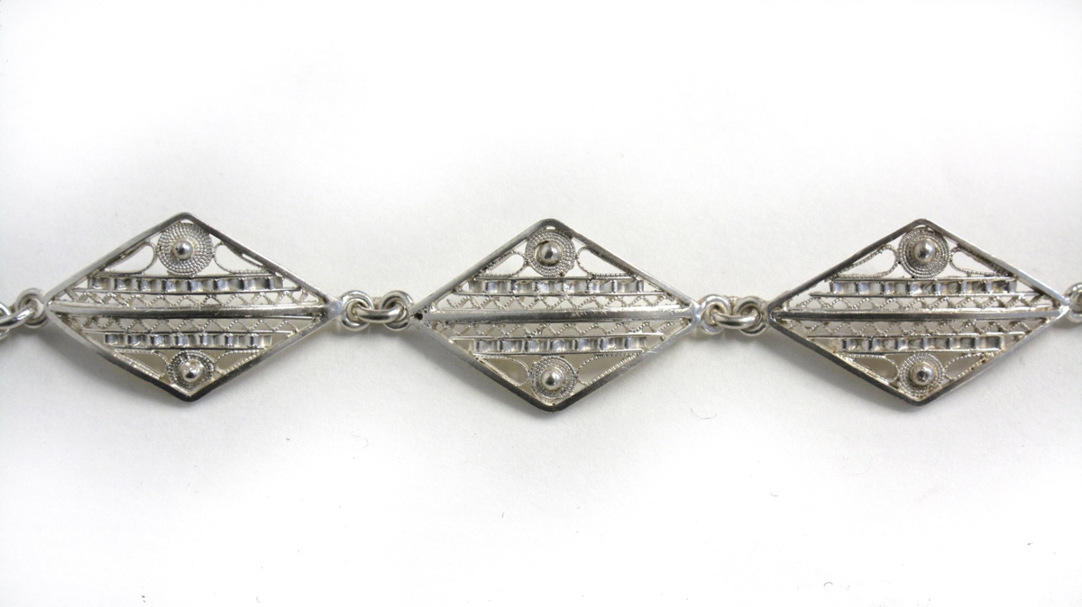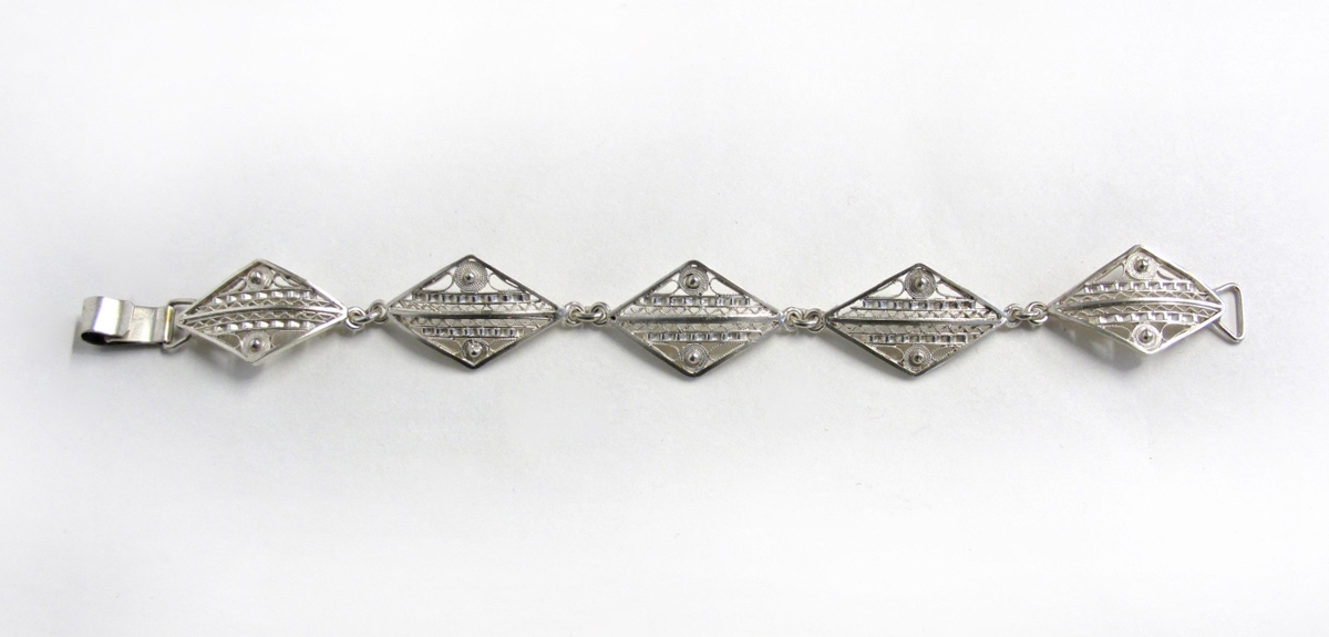Víravirkisarmband úr silfri. Armbandið er gert úr fimm tígullaga stokkum skreyttum víravirki. Á hverri doppu eru tvö korn. Doppurnar eru festar saman með hlekkjum. Á armbandinu er krækja til að festa það um úlnlið og á henni eru tveir stimplar: SJH og 925S. Fyrri stimpillinn er smiðsstimpill Sigtryggs Jóns Helgasonar gullsmiðs. Það er síðari stimpill hans, því áður notaði hann stimpilinn SH. Því má ætla að armbandið sé frá síðari hluta 20. aldar. Hinn stimpillinn er gæðastimpill silfursins, þ. e. 925/1000 hlutar silfurs (sterlingsilfur). Armbandið er í mjög góðu ástandi.