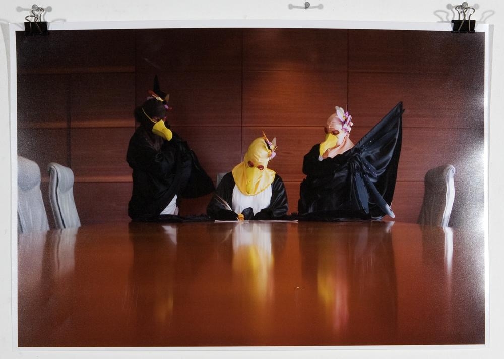 Myndin sýnir 3 manneskjur í gervi fugla, þ.e. með gogga og tilbúnar fjaðrir, svartir gallar. Ein er með brúnan gogg, önnur gulan og þriðja með bleikan. Ein situr við enda langborðs og er að skrifa með fjaðrapenna. Hinar standa yfir henni sitt hvorum megin við hana. Virðast vera staðsettar í ráðhúsi Reykjavíkjur. Manneskjurnar eru meðlimir gjörningaklúbbsins.