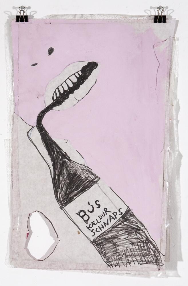 Teiknað með svörtum filtpenna, málað með bleikri akrílmálningu aftan á þunnan pappírsdúk- Andlit, sést í opinn munn og nasaholur. Við munn andlitsins sést í flösku með svörtum vökva, vökvinn er að renna upp í munninn. Á flöskunni stendur: 'Bús, kældur schnaps'. - Neðst í vinstra horninu er búið að skera út lítið gat sem minnir á hjarta- Glært límband á öllum könntum.