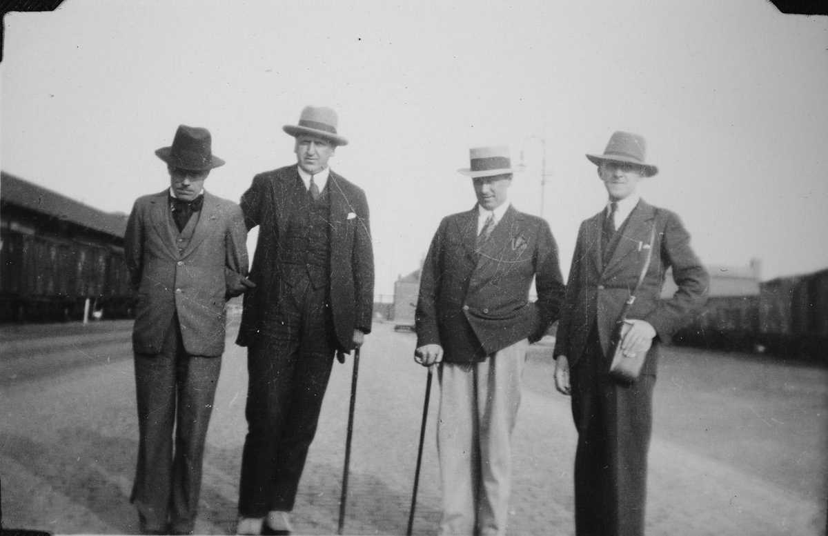 Halldór Laxness og Þórbergur Þórðarson nýkomnir af rithöfundaþingi í Noregi 1930. Tekið í Leith í Skotlandi. Ásamt söngvurunum Eggerti Stefánssyni og Sigurði Skagfield. Úr albúmi Ingibjargar Laxness. 3.-4. áratugur.
