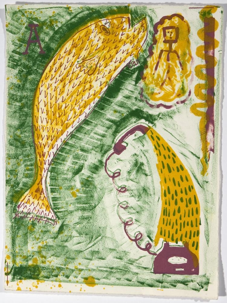 Flatþrykk, virðist vera silkiþrykk og steinþrykk, á hvítan þykkan pappír. Bakgrunnur er steinþrykk með grænni málningu. Fígúratíf teikning af manni, fiski og síma í forgrunni - silkiþrykk með bleikfjólublárri málningu.