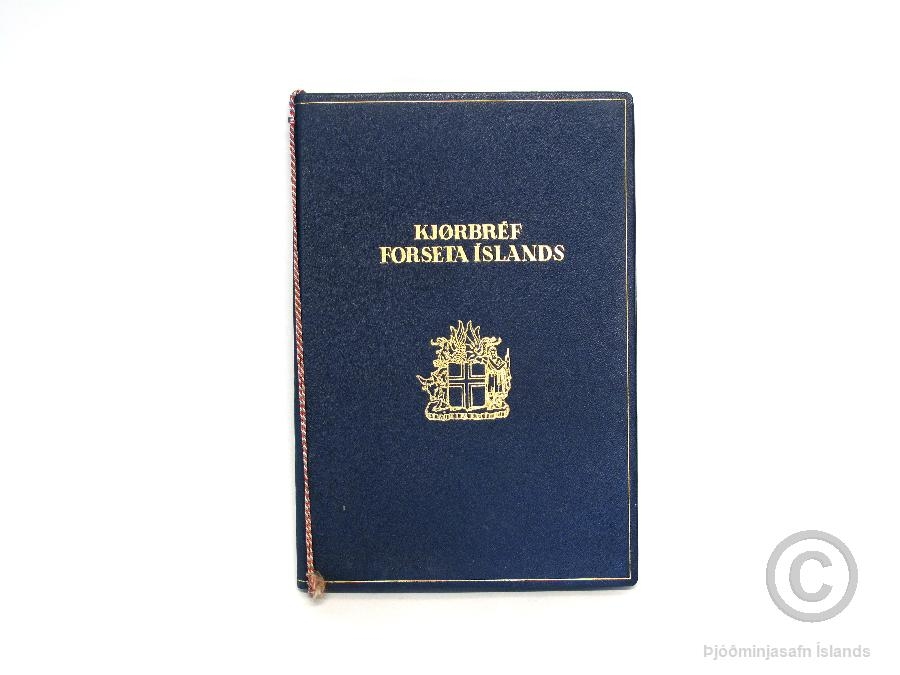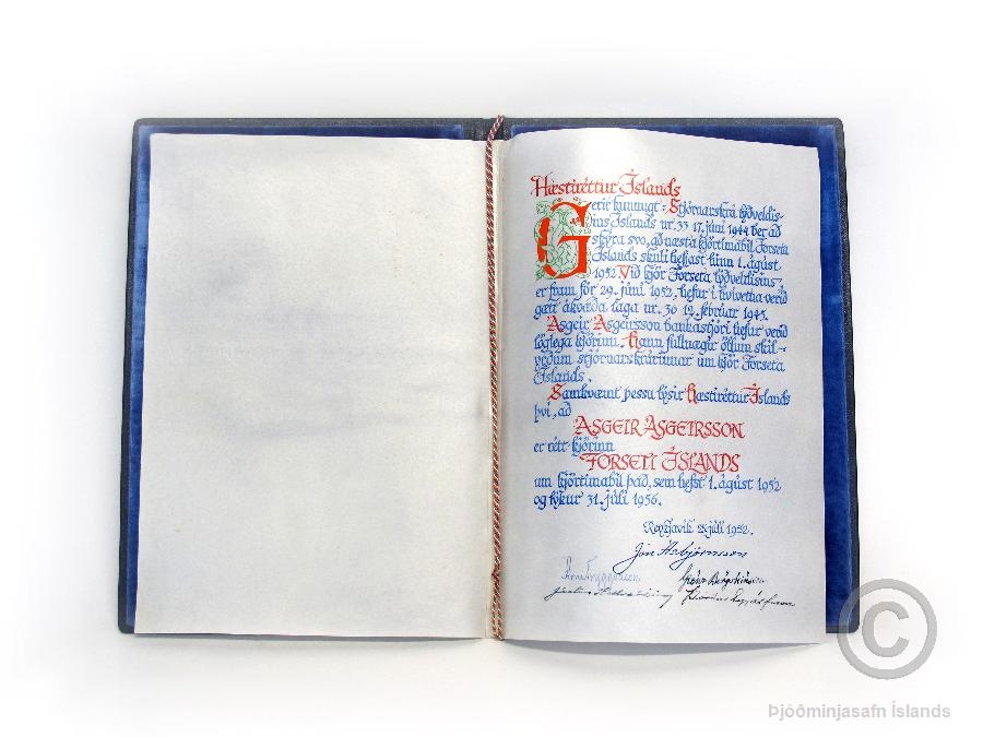 Skrautritað kjörbréf forseta Íslands, Ásgeirs Ásgeirssonar, dagsett 25. júlí 1952. Ásgeir var annar forseti Íslands og sá fyrsti sem kosinn var til þess embættis í almennum kosningum. Hann sat í embætti í fjögur kjörtímabil, frá 1952 til 1968. Skjalið er í blárri harðspjaldakápu. Á framhlið kápunnar er gyllt skjaldarmerki lýðveldisins og þar fyrir ofan stendur: KJØRBRÉF FORSETA ÍSLANDS. Skjalið sjálft er bundið við kápuna með snúru í íslensku fánalitunum og er skrautritað með bláu og rauðu bleki. Í því stendur: