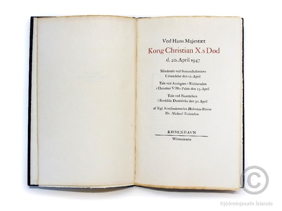 Prentuð skrá með nokkrum minningarræðum sem fluttar voru í Danmörku í kjölfar andláts Kristjáns konungs tíunda þann 20. apríl 1947. Skráin er bundin í kápu sem klædd er svörtu gervileðri með gyllingu á. 575 slíkar skrár voru prentaðar og númeraðar. Þessi skrá er númer 46. Á saurblöðum og titilblaði skrárinnar stendur: