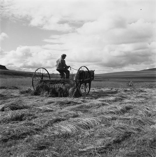 Slegið með sláttuvél. Guðlaugur Jóhannesson f. 5.8.1897.
