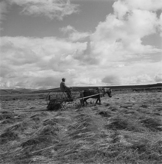 Slegið með sláttuvél. Guðlaugur Jóhannesson f. 5.8.1897.