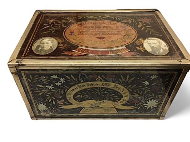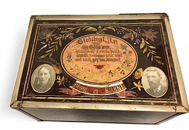 Málmkistill með myndum. Á loki eru myndir af Guðnýju Guðnadóttur og Bjarna Jónssyni snikkara. Í neðra horni stendur: Gleðilegt ár og góða öld. Framan á kistli stendur: Til minningar um liðna öld frá BJ til GG aldamótin 1900.