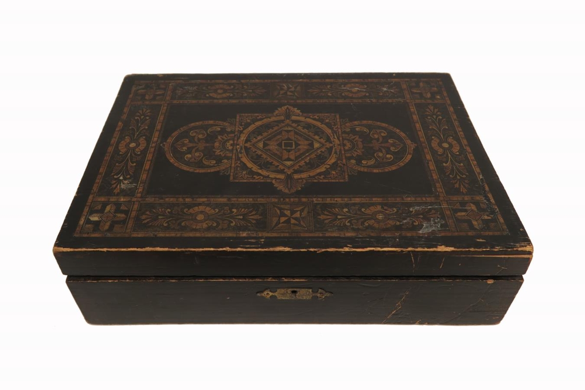 Dökkur viðarkassi. Á lok kassans er málað munstur.