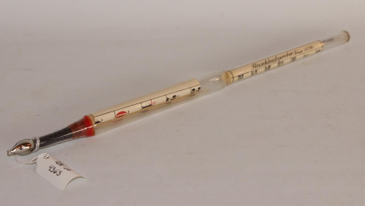 Mælir, bæði fyrir salt- og hitastig, úr gleri. L. 32 cm. Á mælirnum stendur: Fleischlaakeprober temp 14° R2 "wasser" o.fl. Nær frá -10°C uppí 30°C. Saltflotið nær frá 0 upp í 30. Mælirinn kemur úr Popps versluninni á Sauðárkróki.
