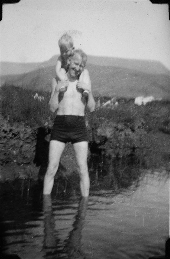 Í Reykjahlíð, Mosfellssveit, sumarið 1934. Halldór með Einar, son sinn á háhest. Úr albúmi Ingibjargar Laxness. 3.-4. áratugur.