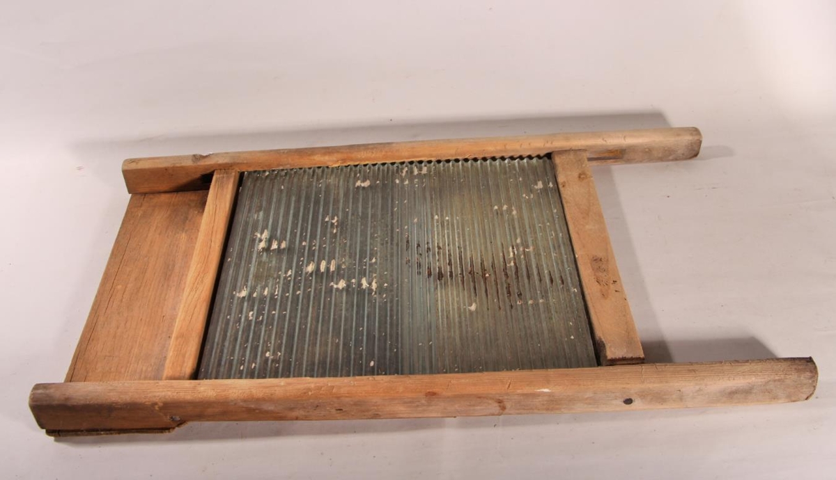 Þvottabretti úr timbri og gleri. L. 57 cm, br. 31 cm. Venjuleg smíð, neglt saman. Ein plata er laus á bakhlið.