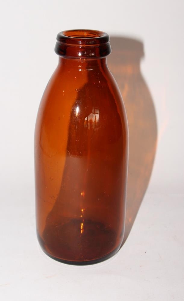 Mjólkurflaska úr brúnu gleri. Hæð 18 cm, þv. botns 7 cm, þv. stúts 4 cm. Stærð er 1/2 ltr.