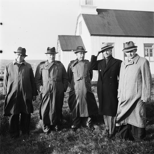 Snorrahátíðarnefndin við Reykholtskirkju. Frá vinstri Guðbrandur Magnússon, Stefán Jóh. Stefánsson forsætisráðherra, Jónas Jónsson formaður og menntamálaráðherra, Ólafur Thors og Sigurður Nordal.
