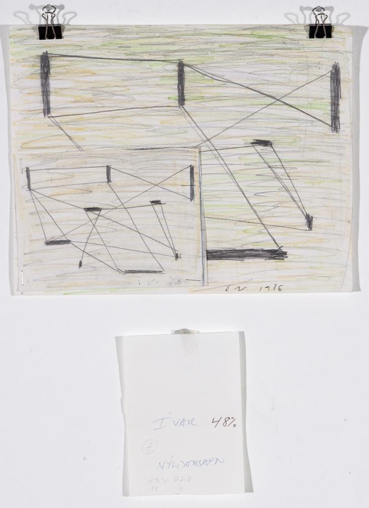 Teikning á A4 blaði. Á blaðið er heftað minna blað með svipaðri teikningu og á því stærra. Teikningin er geometrískt form, teiknað með blýanti. Bakgrunnurinn er krotaður með gulum og grænum vaxlitMinna og stærra blaðið hafa bæði áritun, ógreinilegri á því stærra. Á minni miðanum stendur 'Ívar 48%, Nýlistasafn' og einhverjar tölur (útreikningar?).