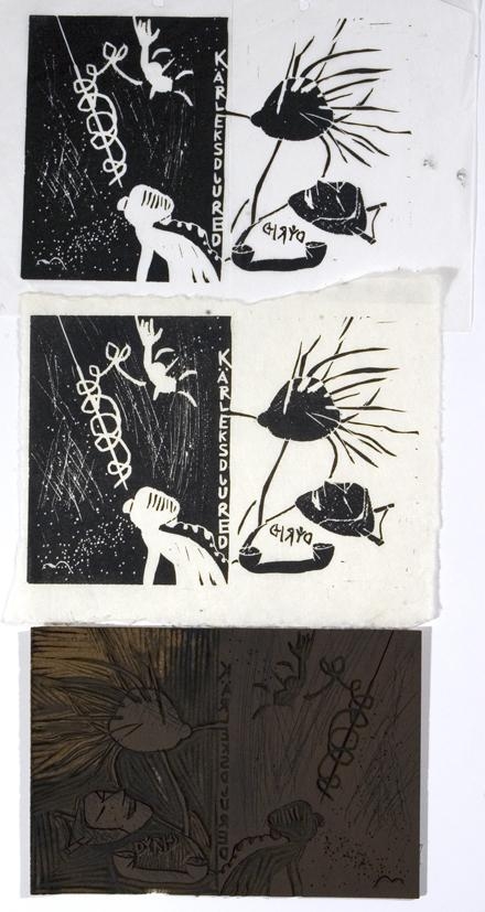 3 dúkristur á ljósan pappír, svart blek - myndin gerir það að verkum að verkið er dekkra vinstramegin á myndfleti. Mótar fyrir mannverum, fígúrum og símtóli. Ritað: 'Dýrið'; 'Kärleksduured'. Ein einingin er á næstum því gegnsæjan pappír, önnur er á pappír sem hefur einhverskonar bómullar áferð.4. einingin er útskorinn lanolíndúkur. Greinilega notaður til að gera grafíkmyndirnar.