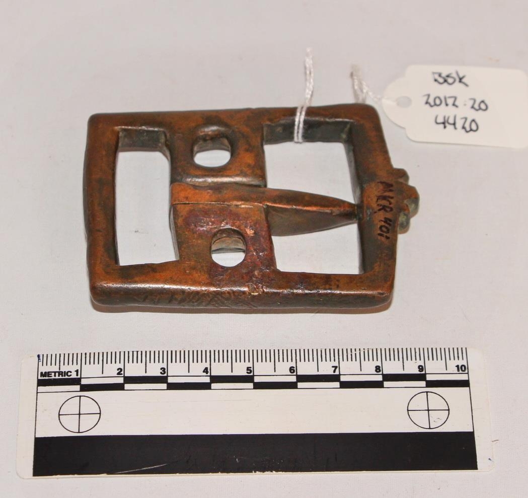 Gjarðarhringja úr kopar. Lengd hliða er 7,8 cm. Br. enda er 6 cm. Frekar stór og þung. Öll mynstruð í blómsveigsmynstri.