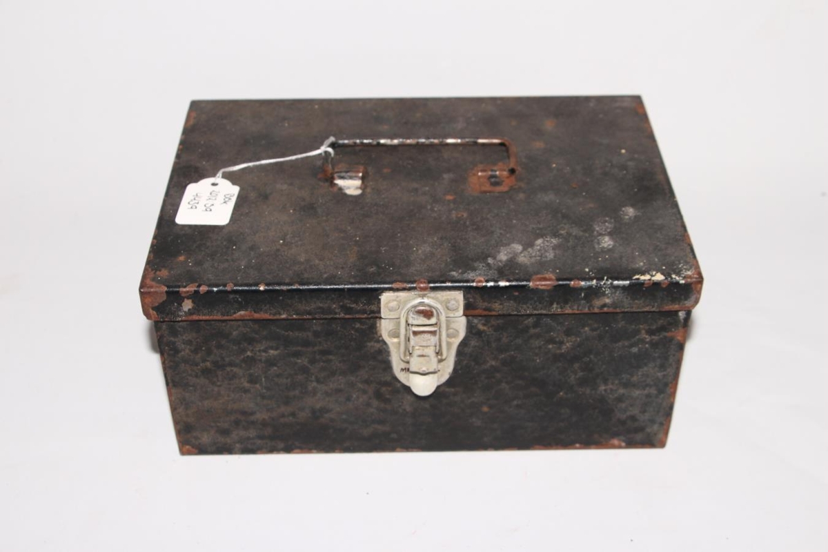 Sjúkrakassi úr járni. Dýpt 16,5 cm, breidd 24,5 cm, hæð 10,7 cm. Svartur kassi. Handfang er á loki og smella framan á til að loka. Ofan í kassanum eru sjúkrabindi, bómull og fleira.