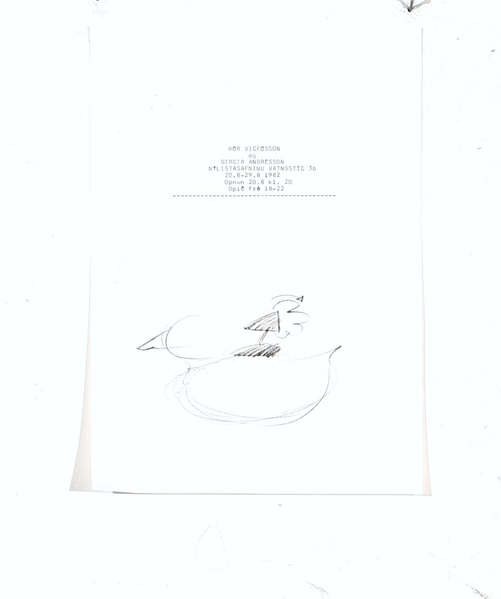 Veggspjald: vegna sýningar Brigis og Þórs 20.8.-29.08.1982, sýnir teikningu af fugli ásamt kynningartexta.
