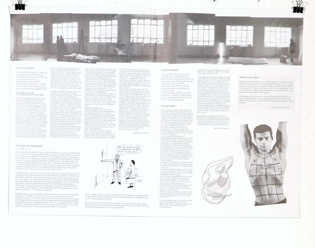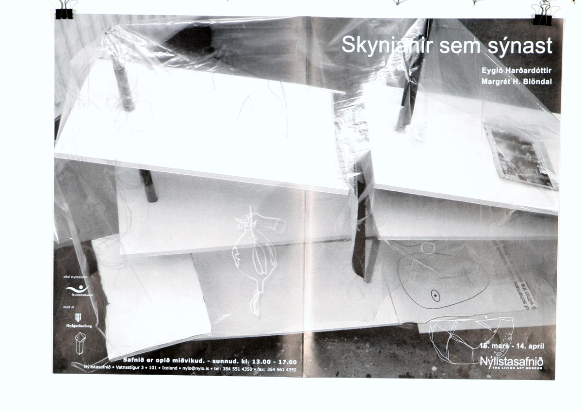 Veggspjald: vegna samsýningar Margrétar og Eyglóar 16.3.- 14.4.2002, sýnir sv/hv ljósmynd ásamt sýningartexta á bakhlið.