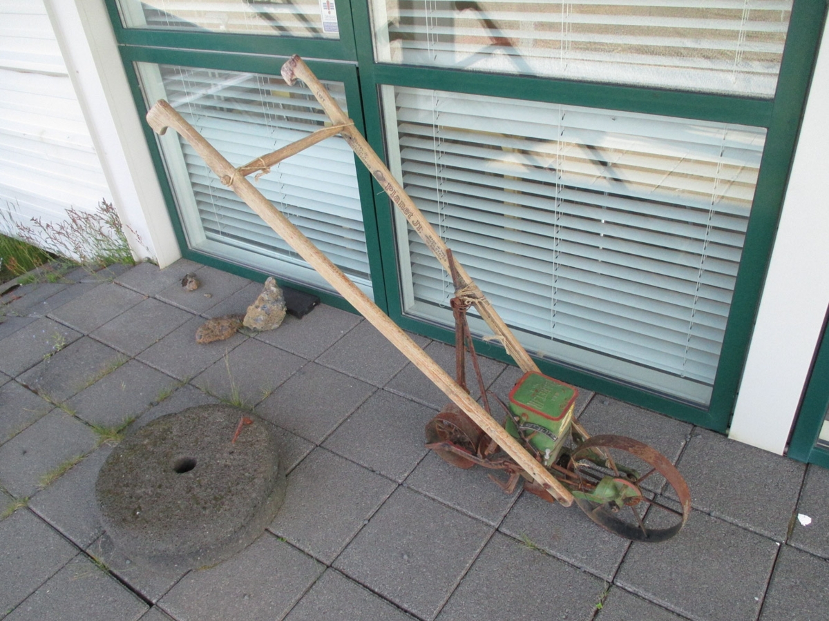 Sáningarvél fyrir gulrófur og gulrætur. Gerð Planet Jr. Framleidd í Bandaríkjunum skv. upplýsingum á handfangi. Vélin er drifin áfram með járnhjóli sem tengist öxli í box sem fræið er í. Boxið er grænt að lit. Sáningarvélinni er ýtt áfram.