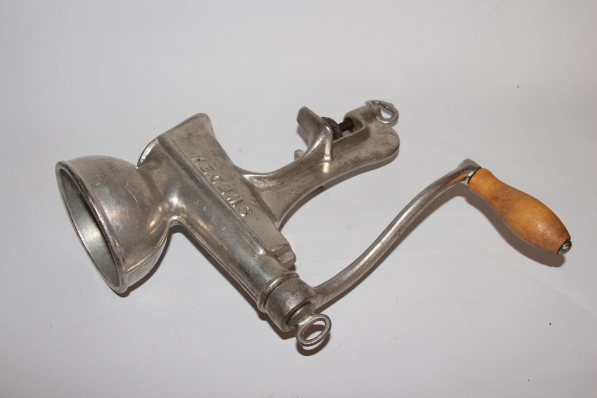 Berjapressa úr járni. H. 33,5 cm, br. 21 cm, þv. 11,5 cm. Líkt hakkavél nema ofan í hjá hnífnum er rifbretti, sveif er á enda til að snúa. Hægt að festa við borð. Tegundin er Husqvarna No. 7. Sænsk framleiðsla.