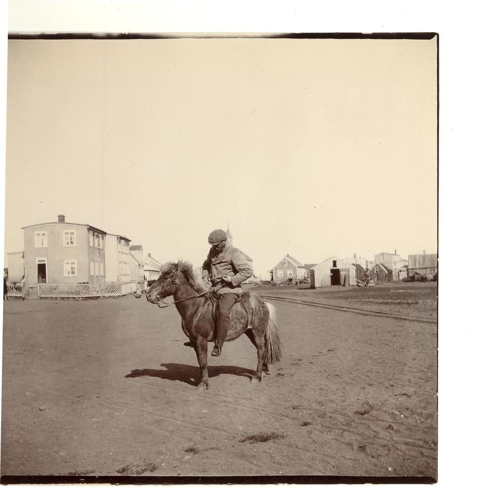 Mynd úr safni Agnesar Lunn, sem hún tók í dvöl sinni á Eyrarbakka. Karlmaður á hesti, hús í baksýn. Myndin er tekin í austur frá Vesturbúðinni. Til vinstri húsin tvö við Búðarstíg, Götuhús og Dampskúrinn til hægri.