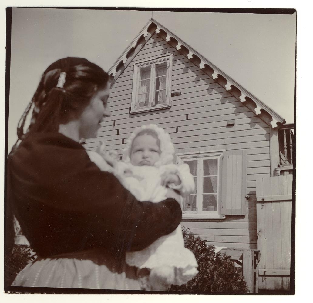 Mynd úr safni Agnesar Lunn, sem hún tók í dvöl sinni á Eyrarbakka. Mynd tekin fyrir framan Assistentahúsið á Eyrarbakka, Karen Nielsen heldur á dóttur sinni Edith Nielsen.