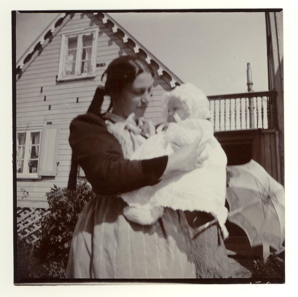 Mynd úr safni Agnesar Lunn, sem hún tók í dvöl sinni á Eyrarbakka. Mæðgurnar Karen og Edith Nielsen. Assistentahúsið í baksýn.