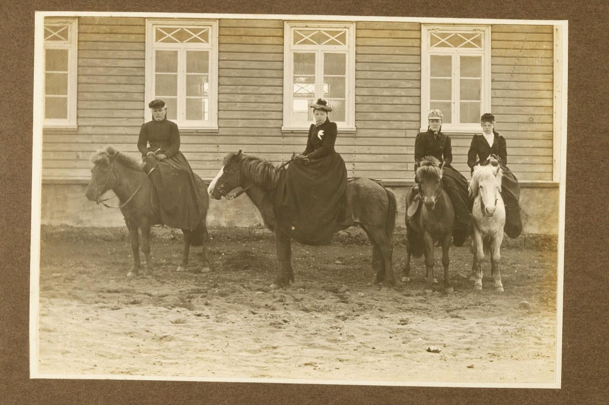 Mynd úr safni Oline Lefolii kaupmannsfrúar á Eyrarbakka. Myndin er af konum í söðlum fyrir norðan Eyrarbakkakirkju.