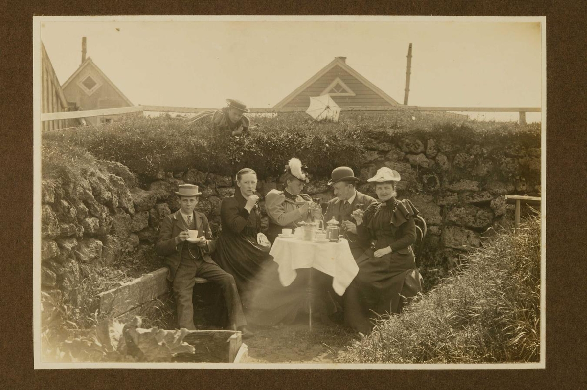 Mynd úr safni Oline Lefolii kaupmannsfrúar á Eyrarbakka. Í baksýn sést í gafl hlöðunnar, þá Ingvarshús og Ísakshús til hægri. Fólkið situr við kaffiborð úti í garði hjá Húsinu.