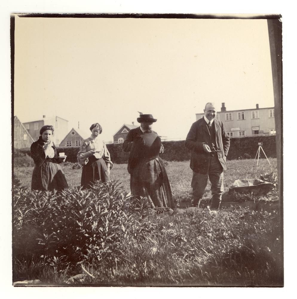 Mynd úr safni Agnesar Lunn, sem hún tók í dvöl sinni á Eyrarbakka. Fólk með kaffibolla á leiðinni út í garð að drekka. Myndin er tekin í aðaldyrum Hússins á Eyrarbakka. Systurnar Guðmunda og Karen Nielsen til vinstri á myndinni, þá sennilega Eugenia Nielsen sem snýr baki í vélina, bak við hana er sennilega Jens. D. Nielsen og lengst til hægri er danskur fuglafræðingur Richard Hørring. Húsin í baksýn eru hlaðan, samkomuhúsið Fjölnir, Garðbær, Ísaksbær og Kirkjubær. Sjóvarnargarðurinn á milli húsa og fólks.